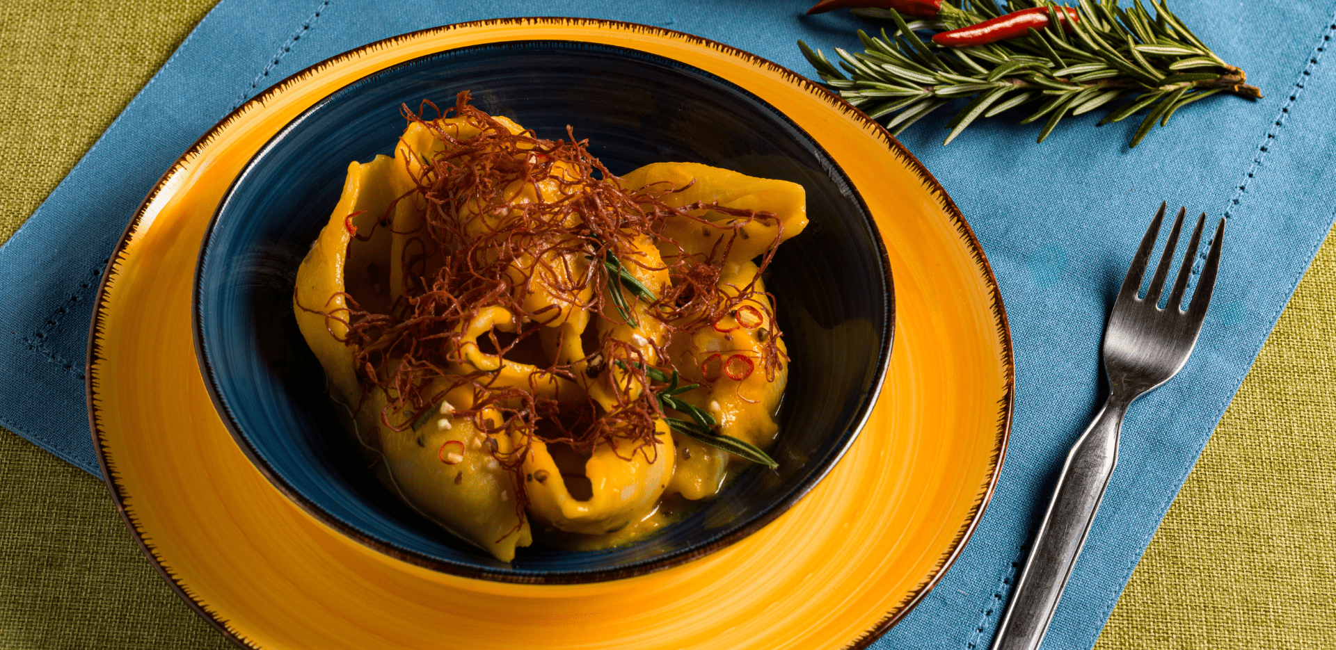 Conchiglioni saporiti Sfilacci, crema di zucca e granella di nocciola