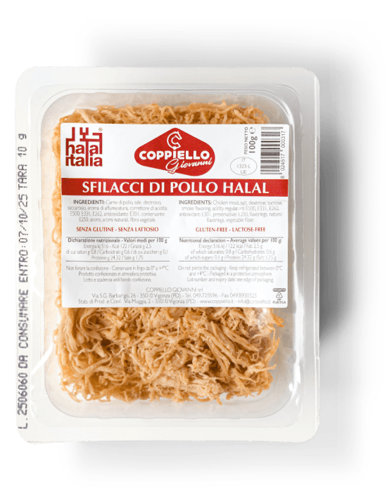 Prepared with selected chicken meat and certified by Halal Italia, Coppiello chicken shreds are a light, versatile and inclusive product. Gluten-free and lactose-free, they combine high-quality ingredients with authentic taste, making them ideal for quick, balanced recipes suitable for different dietary needs.