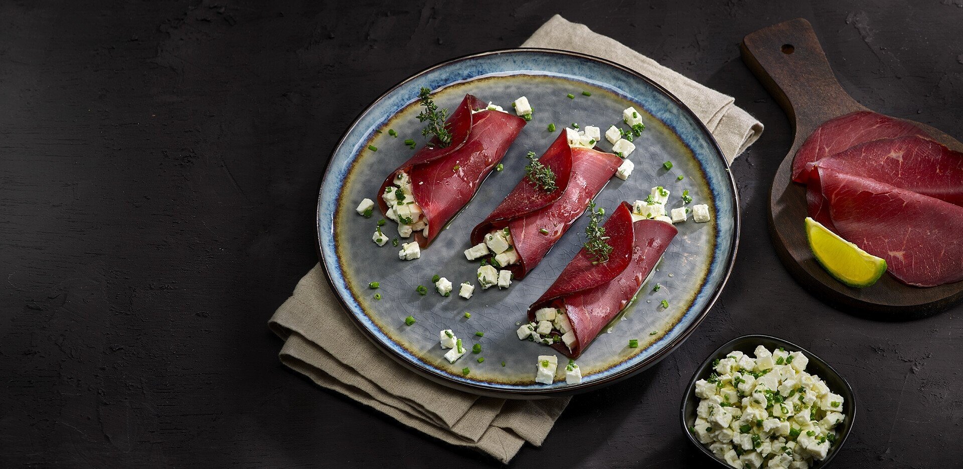Greek-style rolls with horse bresaola are a quick and fresh dish to prepare.