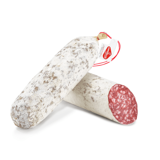Horse salami with garlic is a specialty made from a combination of raw horse and pork meats, seasoned with salt, spices, herbs, and garlic for a bold and unmistakable flavor. After being minced, the meats are stuffed into natural casings and undergo a minimum aging period of 20 days, ensuring ideal flavor and texture. The casing is not edible.