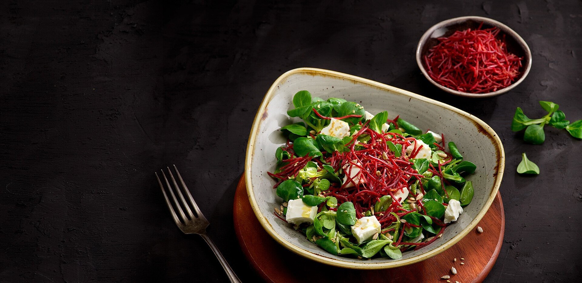 Salad, seeds, fresh cheese, and JULIENNE of Horse Bresaola