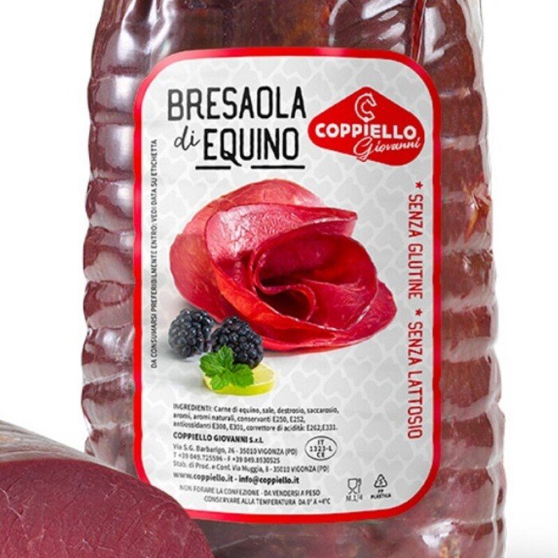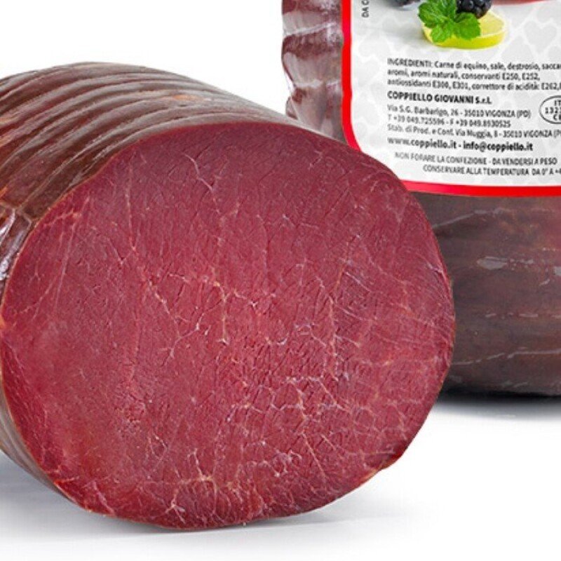 Horse bresaola is a refined specialty, ideal for those seeking a tasty and light product that adds a touch of quality to any meal. Made from trimmed horse meat and treated in brine with a carefully selected blend of salt, spices, additives, and seasonings, this bresaola undergoes a minimum aging process of 6 weeks.