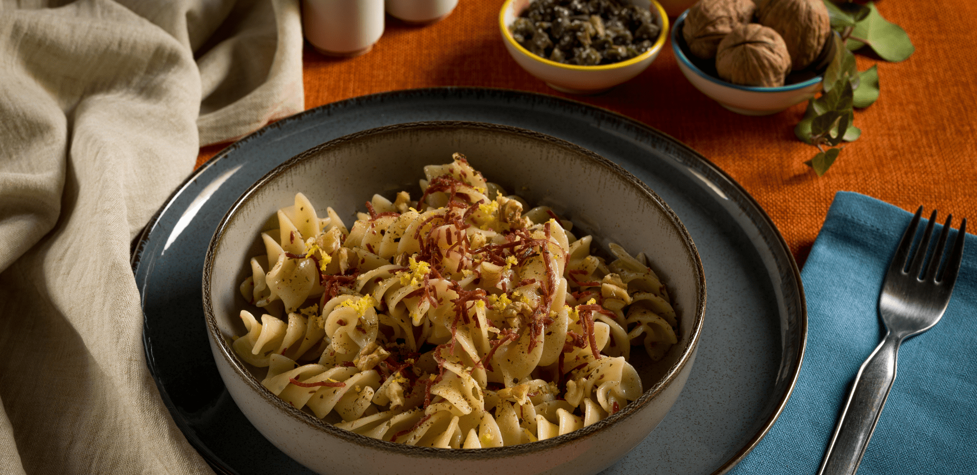 Fusilloni alla crema di burro aromatizzata al limone, Julienne di Bresaola, granella di noci e polvere di cappero