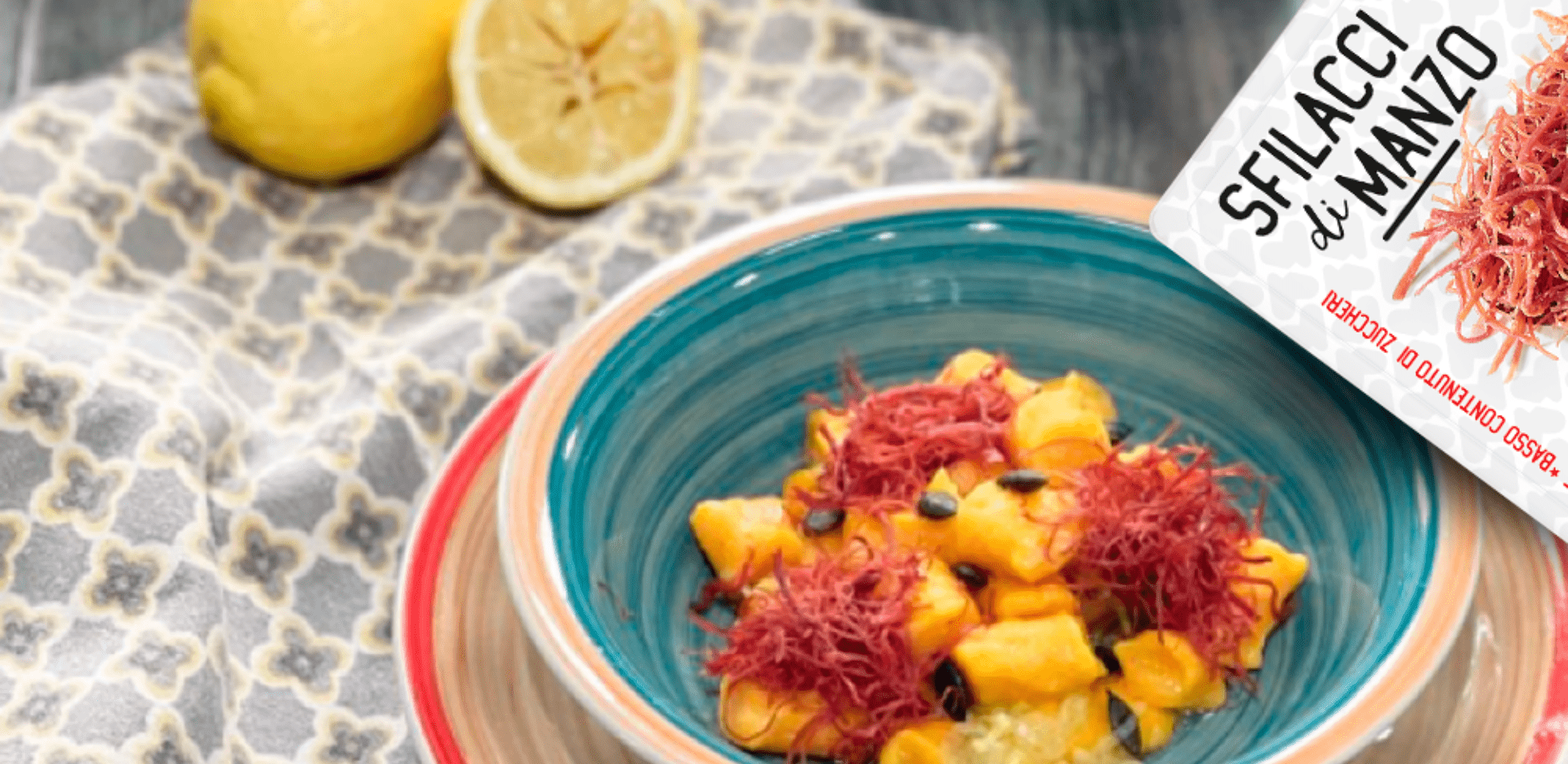 Passate alla cottura degli gnocchi, spadellateli con il porro e lo zenzero, impiattate e servite decorando con gli sfilacci ed i semi di zucca.