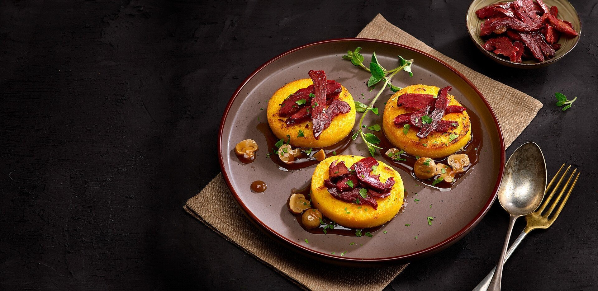 Capovolgete la polenta raffreddata e rassodata sul piano di lavoro e con uno stampo rotondo preparate dei dischetti. Arrostiteli su una piastra ben calda. (meglio ancora se la polenta è fatta il giorno prima). Mettete in un piatto un letto di funghi con il loro sughetto adagiate le fette di polenta, mettete su ogni fetta un un cucchiaio di di Straeca 2.19 di equino. Un po' di prezzemolo e… buon appetito!