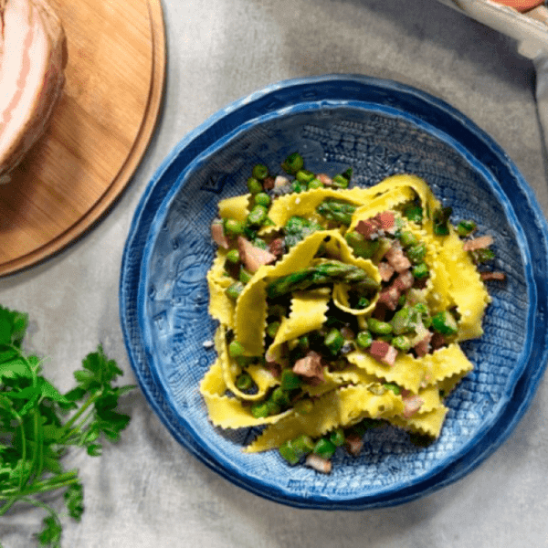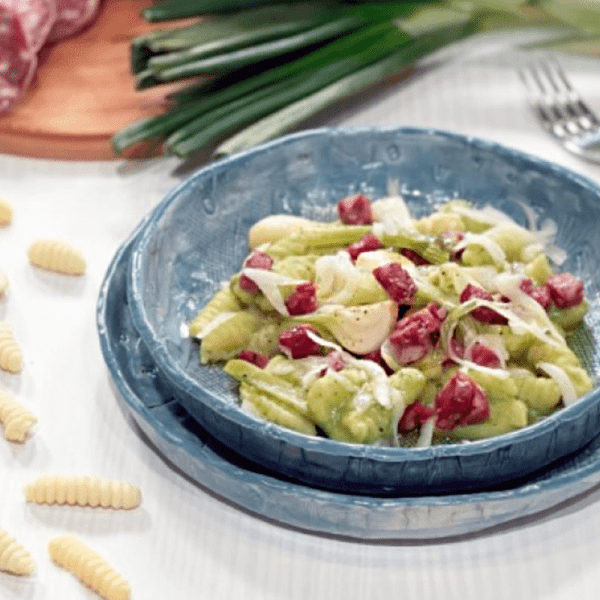 Gnocchetti sardi con crema di fave, pecorino e salame