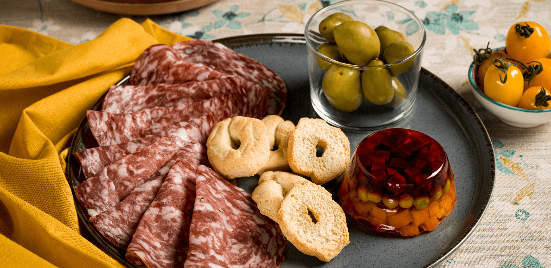 - Servite in tavola disponendo a piacere in un piatto di portata i salumi, accompagnateli con le olive in un bicchierino e le verdure Geléé;