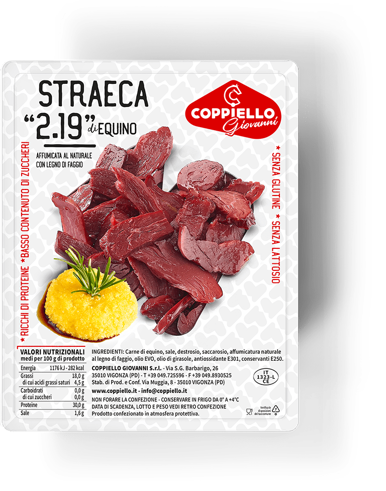 La straeca di equino è una specialità che nasce da una ricetta tramandata fin dagli anni Sessanta, arricchita da antichi metodi di affumicatura naturale con legno di faggio. Preparata con diaframma di prima scelta, viene insaporita con sale e aromi, cotta al vapore e affettata, quindi confezionata con una delicata miscela di olio extra vergine di oliva e olio di girasole.
